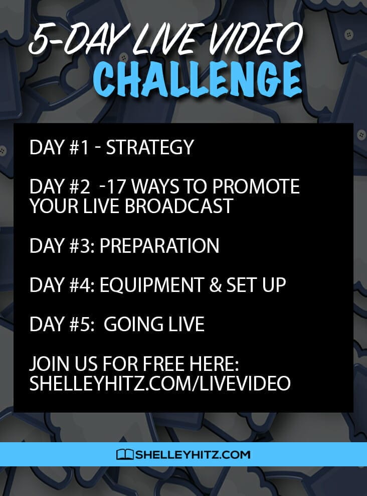 The purpose of this five day live video challenge is to take you through the steps to prepare you to go live. I’m going to challenge you to take action, and by the end of the five days, to go live. I want to see how many of you are willing to do this. Let’s do it together, let’s support each other, and let’s just dive in.