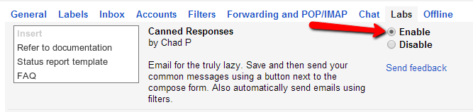 Next, scroll down until you see “Canned Responses” and click the radio button next to “Enable.”